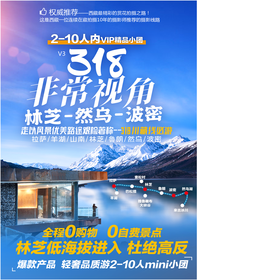318川藏线—中国66号公路。318线被中国国家地理誉为中国景观大道,川藏公路以风景优美路途艰险著称,一路景色壮丽,有雪山、原始森林、草原、冰川和若干大江大河,是旅游探险爱好者和摄影师的极乐所在!林芝到然乌是318线最精彩的路段!